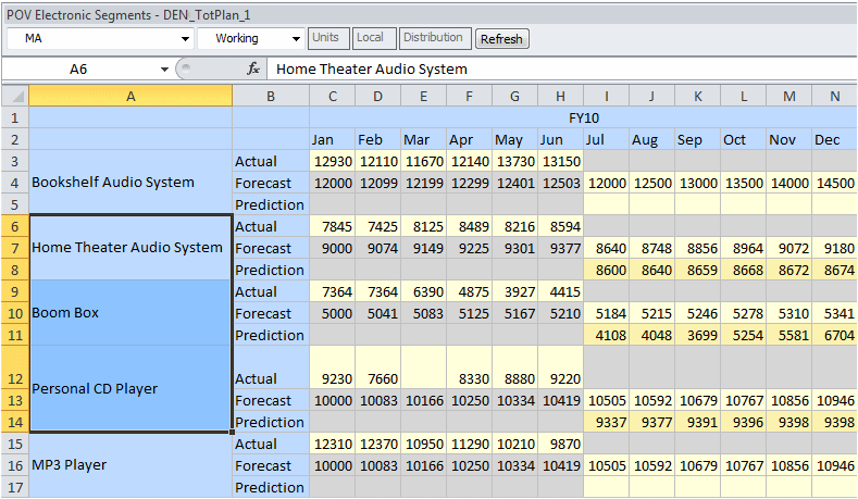 在圖 1-3 中,使用者選取了三個選取的成員名稱,然後選取快速預測選取成員。由於選擇包括多個案例版本選項,使用者必須回覆提示。接著,預測值會貼到「內置揚聲器」與「個人 CD 播放器」成員的「預測」版本。
