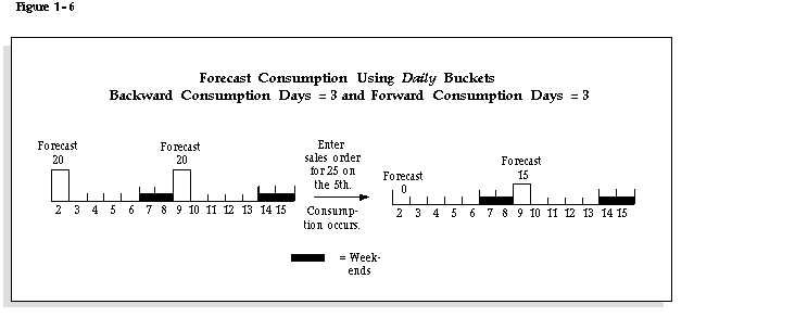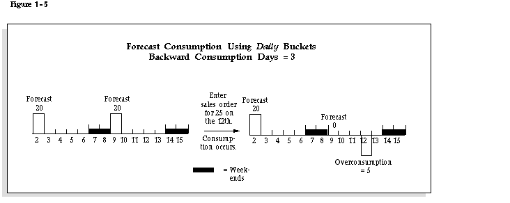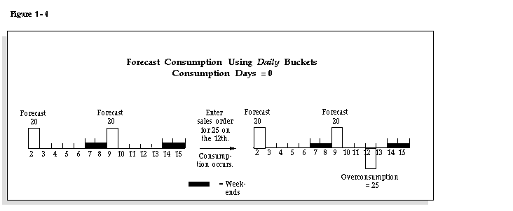 The process tries to consume a forecast entry on the 12th (the sales order date) because the forecast is stated in daily buckets and no backward consumption days exist. Since there are no forecasts on the 12th, an overconsumption entry is created on the 12th and the forecasts remain the same.