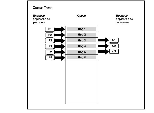 Figure 7-2, "Modeling Basic Queuing" (below) portrays a queue table that contains one queue into which messages are being enqueued and from which messages are being dequeued.