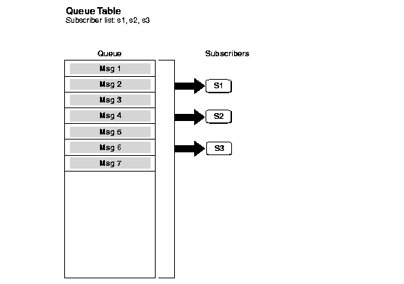 Figure 7-4 describes the case in which three consumers are all listed as subscribers of a queue. This is the same as saying that they all subscribe to all the messages that might ever be enqueued into that queue. The drawing illustrates a number of important points: