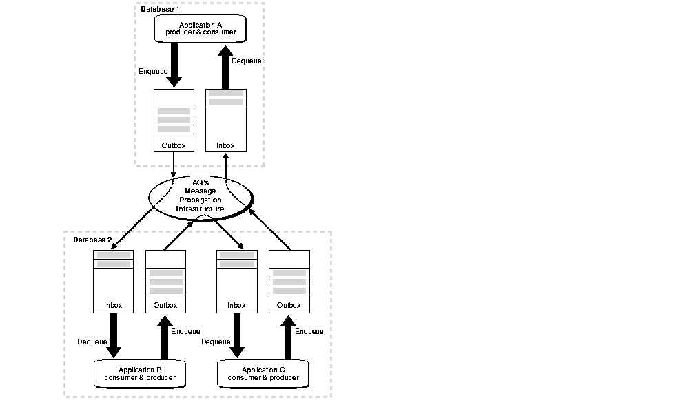 Figure 7-10 illustrates applications on different databases communicating via AQ. Each application has an inbox and an outbox for handling incoming and outgoing messages. An application enqueues a message into its outbox irrespective of whether the message has to be sent to an application that is local (on the same node) or remote (on a different node).