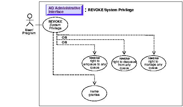 /* To revoke the DEQUEUE_ANY system privilege from Jones. */ CONNECT system/manager; execute DBMS_AQADM.REVOKE_SYSTEM_PRIVILEGE(privilege=>'DEQUEUE_ANY', grantee=>'Jones');