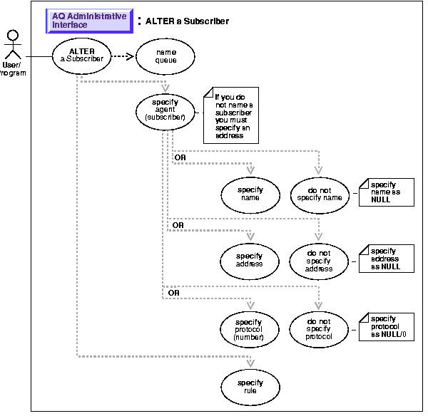 /* Add a subscriber with a rule: */ DECLARE subscriber sys.aq$_agent; BEGIN subscriber := sys.aq$_agent('SUBSCRIBER1', 'aq2.msg_queue2@london', null); DBMS_AQADM.ADD_SUBSCRIBER( queue_name => 'aq.msg_queue', subscriber => subscriber, rule => 'priority < 2'); END; /* Change rule for subscriber: */ DECLARE subscriber sys.aq$_agent; BEGIN subscriber := sys.aq$_agent('SUBSCRIBER1', 'aq2.msg_queue2@london', null); DBMS_AQADM.ALTER_SUBSCRIBER( queue_name => 'aq.msg_queue', subscriber => subscriber, rule => 'priority = 1'); END;