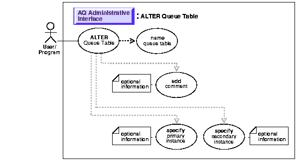 /* Altering the table to change the primary, secondary instances for queue owner (only applicable for OPS environments).The primary instance is the instance number of the primary owner of the queue table. The secondary instance is the instance number of the secondary owner of the queue table. */ EXECUTE dbms_aqadm.alter_queue_table ( Queue_table => 'aq.ObjMsgs_qtab', Primary_instance => 3, Secondary_instance => 2); /* Altering the table to change the comment for a queue table: */ EXECUTE dbms_aqadm.alter_queue_table ( Queue_table => 'aq.ObjMsgs_qtab', Comment => 'revised usage for queue table');