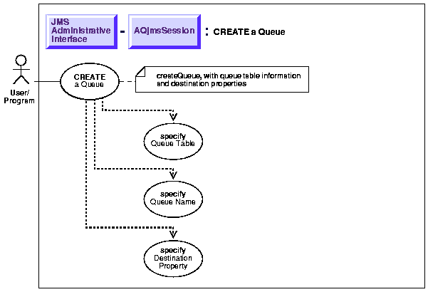 QueueSession q_sess; AQQueueTable q_table; AqjmsDestinationProperty dest_prop; Queue queue; queue = ((AQjmsSession)q_sess).createQueue(q_table, "jms_q1", dest_prop);