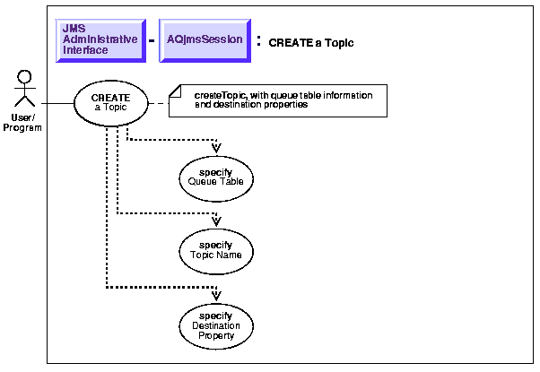 TopicSession t_sess; AQQueueTable q_table; AqjmsDestinationProperty dest_prop; Topic topic; topic = ((AQjmsSessa)t_sess).createTopic(q_table, "jms_t1", dest_prop);