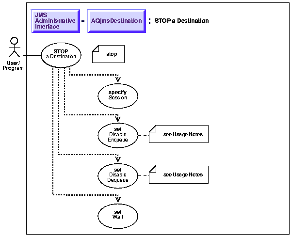 See Java (JDBC): Oracle8i Supplied Java Packages Reference, oracle.jms, AQjmsDestination.stop