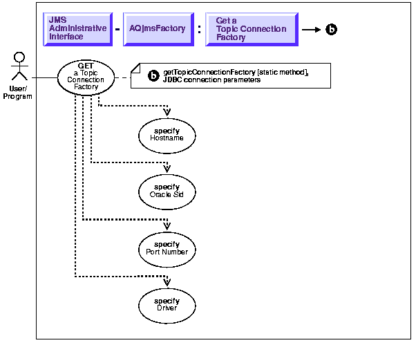 String host = "dlsun"; String ora_sid = "rdbms8i" String driver = "thin"; int port = 5521; TopicConnectionFactory tc_fact; tc_fact = AQjmsFactory.getTopicConnectionFactory(host, ora_sid, port, driver);