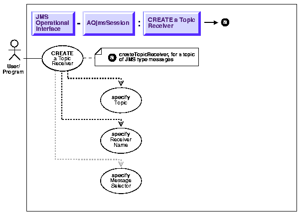TopicConnectionFactory tc_fact = null; TopicConnection t_conn = null; TopicSession t_sess = null; TopicSession jms_sess; Topic shipped_orders; int myport = 5521; TopicReceiver receiver; /* create connection and session */ tc_fact = AQjmsFactory.getTopicConnectionFactory("MYHOSTNAME", "MYSID", myport, "oci8"); t_conn = tc_fact.createTopicConnection("jmstopic", "jmstopic"); jms_sess = t_conn.createTopicSession(true, Session.CLIENT_ACKNOWLEDGE); shipped_orders = ((AQjmsSession )jms_sess).getTopic("WS", "Shipped_Orders_ Topic"); receiver = ((AQjmsSession)jms_sess).createTopicReceiver(shipped_orders, "WesternRegion", null);