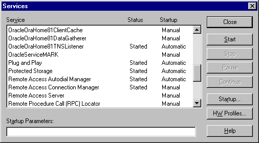 Use the Services dialog box to start, stop, pause, or continue each of the Oracle services available on the computer.
