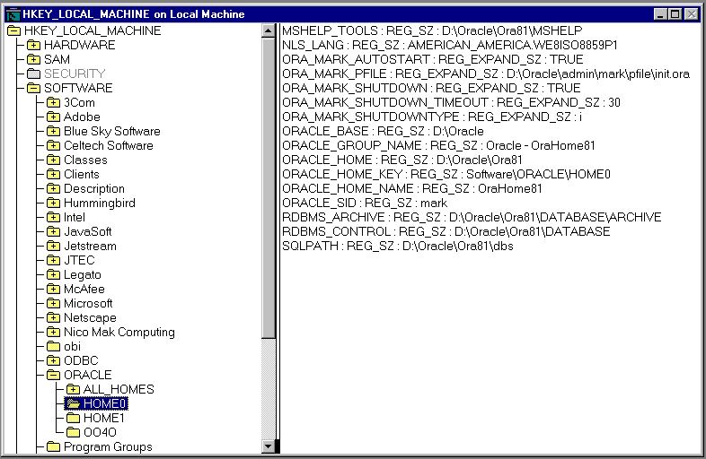 The Oracle database stores its configuration information in a structure known as the registry. You can view and modify this configuration information through the registry editor. The registry contains configuration information for your computer, and must not be accessible for editing by inexperienced users. Only experienced administrators should view and change this information.