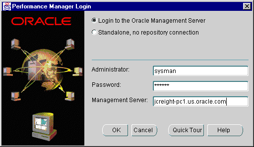 Select whether to log on to the Management Server or to log on in standalone mode. If "Login to Oracle Management Server" is chosen, additionally enter the Oracle Enterprise Manager administrator user name, password and location of the Management Server.