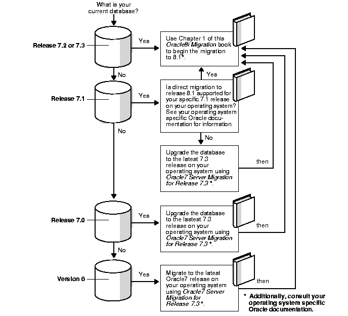 Figure 5-1 is a roadmap that specifies the documentation you should use to migrate your database to release 8.1 based on your current release of Oracle.
