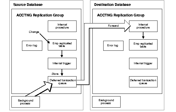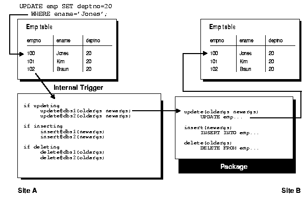 The internal trigger captures any DML and immediately propagates these actions to all other master sites in the replication environment. The internal trigger applies these actions in the security context of the propagator's database link and uses an internal RPC to apply these actions at the destination site.
