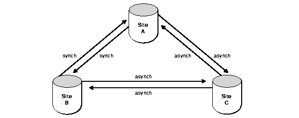 As another example, consider what would happen if you created site A as the master definition site, then added site C with an asynchronous propagation mode, then added site B with a synchronous propagation mode? Now the propagation modes would be as shown in Figure 2-10.