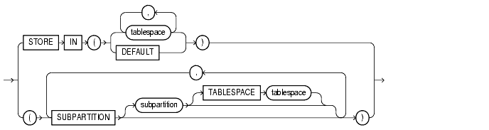 specifies one or more tablespaces in which to store all subpartitions in partition or one or more individual subpartitions in partition. The subpartition inherits all other attributes from partition. Attributes not specified for partition are inherited from index. |