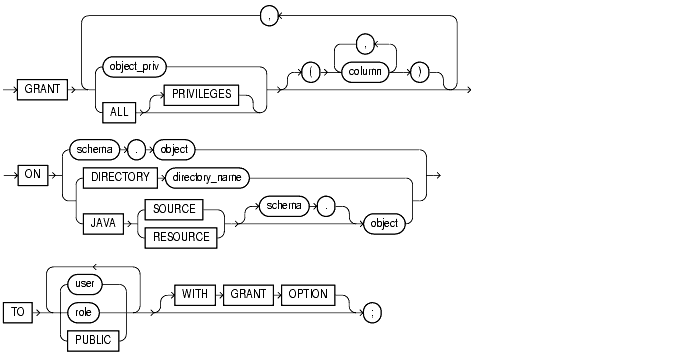 To grant privileges for a particular object to users, roles, and PUBLIC. To grant system privileges and roles, use the GRANT system_privileges_and_roles statement described in the previous section of this chapter. Table 7-7 summarizes the object privileges that you can grant on each type of object.