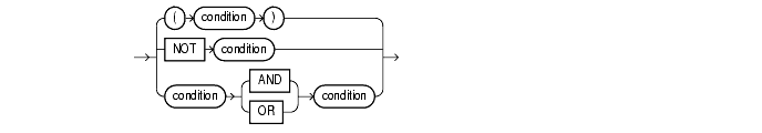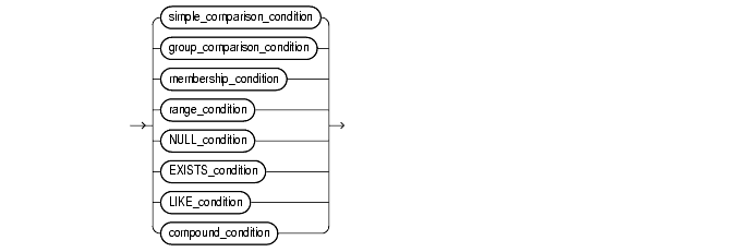 Conditions can have several forms, as shown in the following syntax. The description of each statement in Chapter 7, "SQL Statements", documents the restrictions on the conditions in the statement. The sections that follow describe the various forms of conditions.