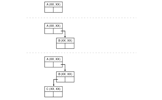 In this structure, each node is a datatype with fields for information, the two co-ordinates, a left-link and a right-link which can point to two children.