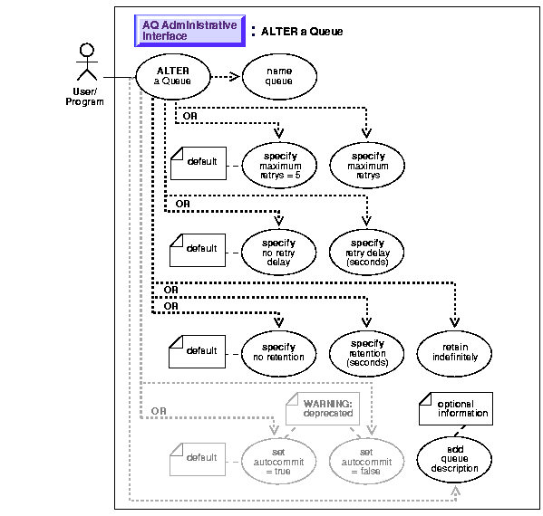 /* Alter queue to change retention time, saving messages for 1 day after dequeueing: */ EXECUTE dbms_aqadm.alter_queue ( queue_name => 'aq.Anothermsg_queue', retention_time => 86400);