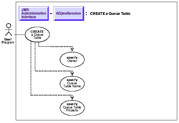 QueueSession q_sess = null; AQQueueTable q_table = null; AQQueueTableProperty qt_prop = null; qt_prop = new AQQueueTableProperty("SYS.AQ$_JMS_BYTES_MESSAGE"); q_table = ((AQjmsSession)q_sess).createQueueTable("boluser", "bol_ship_queue_table", qt_prop);