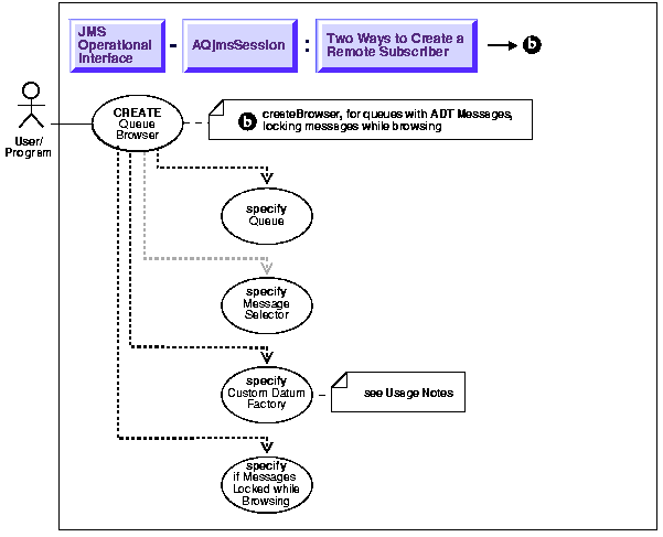 /* Create a browser for a Queue with Adt messages of type EMPLOYEE* in lock mode/ QueueSession jms_session QueueBrowser browser; Queue test_queue; browser = ((AQjmsSession)jms_session).createBrowser(test_queue, null, Employee.getFactory(), true);