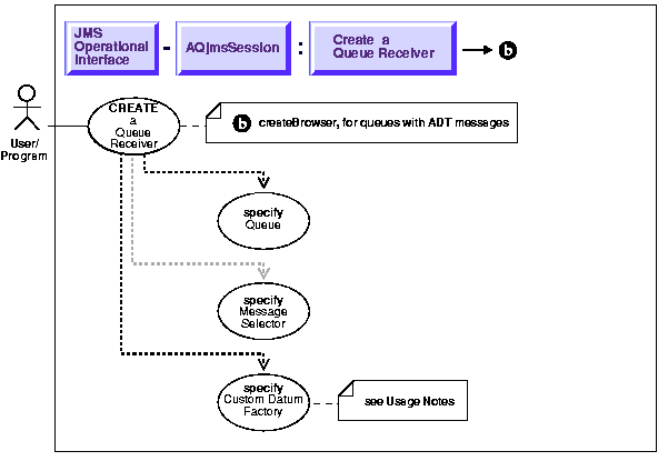 /* Create a receiver for a Queue with Adt messages of type EMPLOYEE*/ QueueSession jms_session QueueReceiver receiver; Queue test_queue; browser = ((AQjmsSession)jms_session).createReceiver(test_queue, "JMSCorrelationID = 'MANAGER', Employee.getFactory());