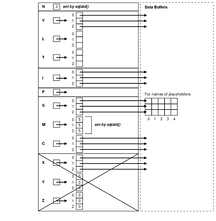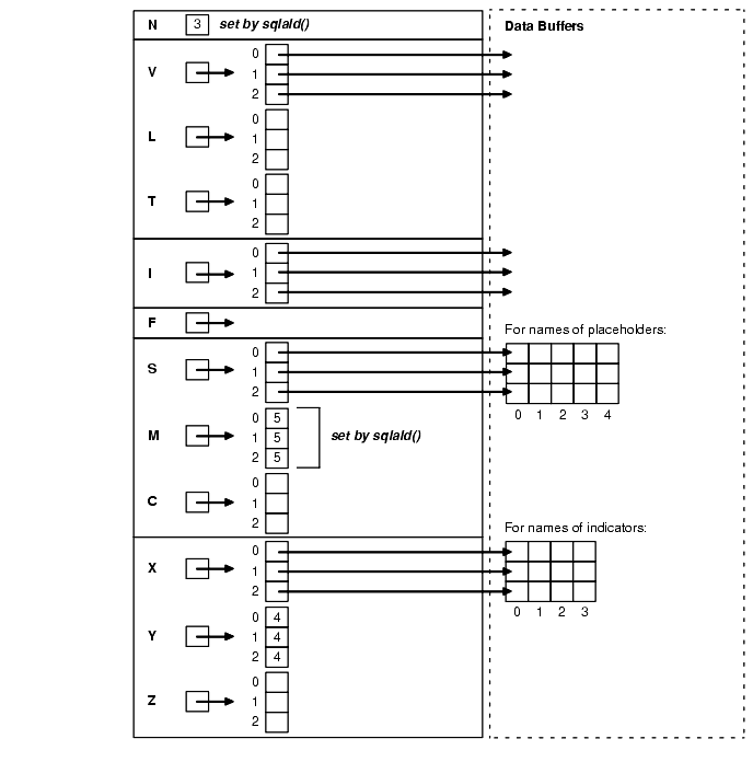 struct SQLDA { long N; /* Descriptor size in number of entries */ char **V; Ptr to Arr of addresses of main variables */ long *L; /* Ptr to Arr of lengths of buffers */ short *T; /* Ptr to Arr of types of buffers */ short **I; * Ptr to Arr of addresses of indicator vars */ long F; /* Number of variables found by DESCRIBE */ char **S; /* Ptr to Arr of variable name pointers */ short *M; /* Ptr to Arr of max lengths of var. names */ short *C; * Ptr to Arr of current lengths of var. names */ char **X; /* Ptr to Arr of ind. var. name pointers */ short *Y; /* Ptr to Arr of max lengths of ind. var. names */ short *Z; /* Ptr to Arr of cur lengths of ind. var. names */ };