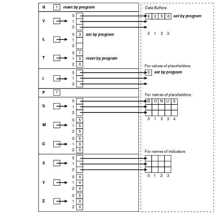 Figure 15-1 shows whether variables are set by SQLSQLDAAlloc() calls, DESCRIBE commands, FETCH commands, or program assignments.