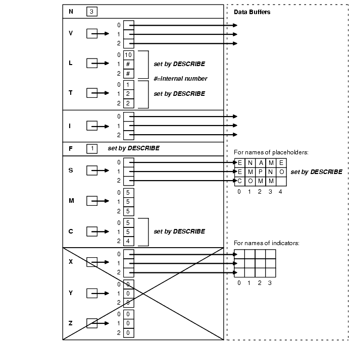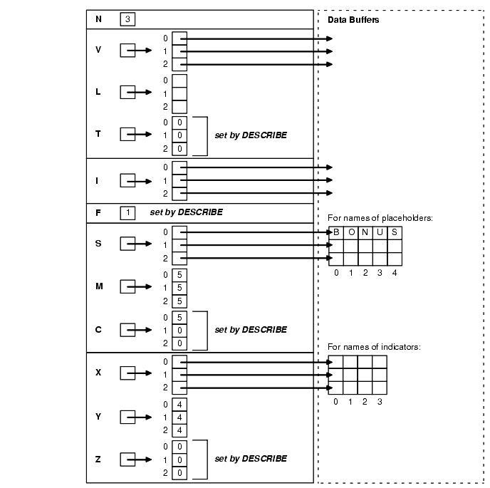 Figure 15-4 shows the bind descriptor in our example after the DESCRIBE. Notice that DESCRIBE has set F to the actual number of placeholders found in the processed SQL statement.