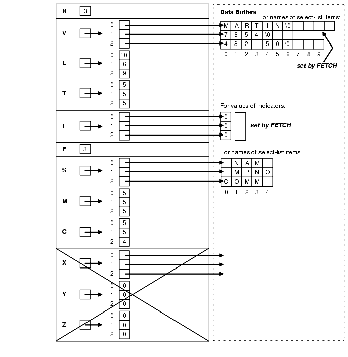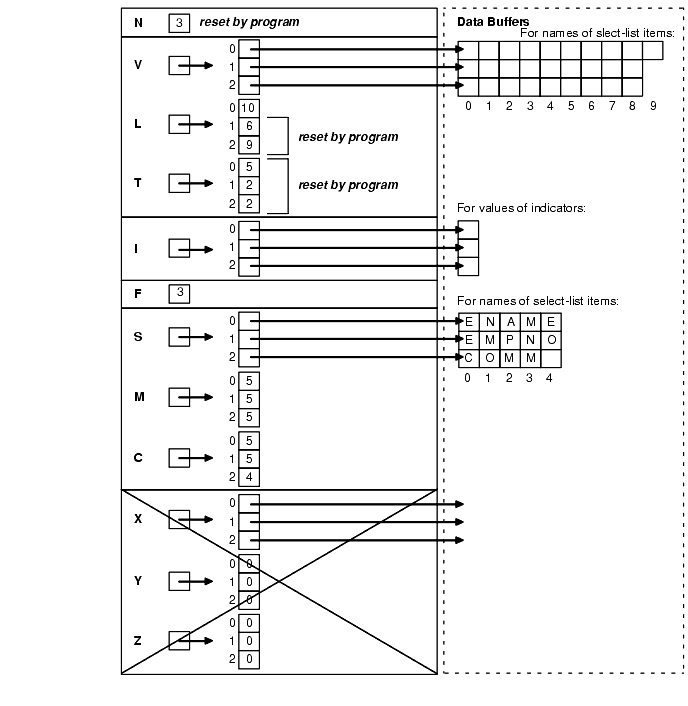 Figure 15-8 shows the select descriptor in our example after the FETCH. Notice that Oracle has stored the select-list and indicator values in the data buffers addressed by the elements of V and I.