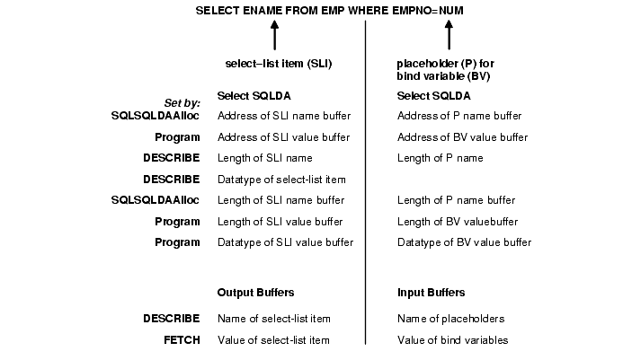 To execute a dynamic SQL statement that contains placeholders for bind variables or select-list items, Oracle needs information about the program variables that hold the input (bind) values, and that will hold the FETCHed values when a query is executed. The information needed by Oracle is: