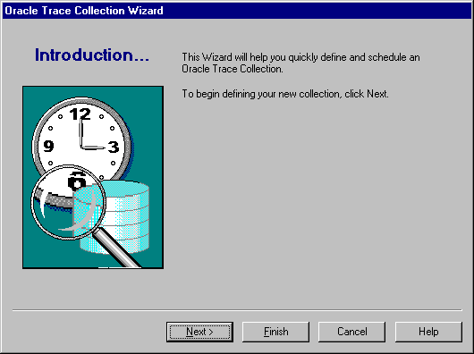 If you are at the top of the tree list (the word Collection is highlighted) and you click the Create Collection toolbar button, the Introduction page of the Oracle Trace Collection Wizard displays, as shown in Figure 3-1.