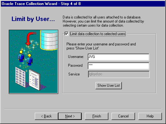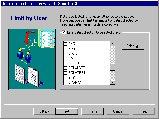 By default, Oracle Trace collects data for all users attached to a database. In step 4, you can restrict the amount of data collected by selecting certain users for data collection (see Figure 3-5).