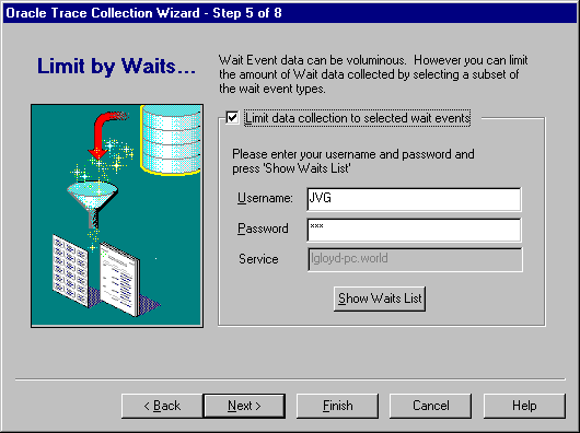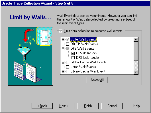 By default, Oracle Trace collects data for all wait events. In step 5, you can restrict the amount of data collected by selecting certain wait events for data collection (see Figure 3-7).