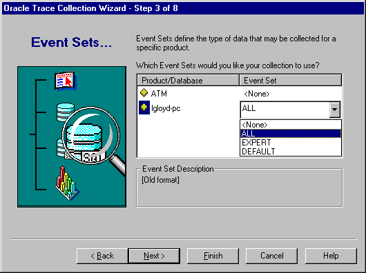 This is a list of event sets for the particular product or database. You may select one event set per product or database, or no event sets if the product or database is not to be part of the collection. Select the event set value you want to use. For Oracle Server, Oracle provides the following event sets: ALL, DEFAULT, EXPERT (Oracle Expert application), CACHEIO (buffer cache I/O), and SUMMARY (Summary Advisor application).