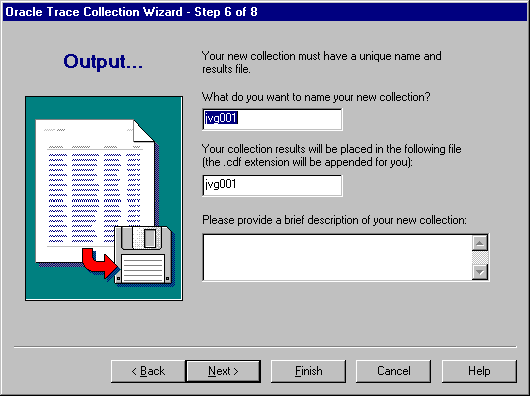In step 6, Oracle Trace provides a default name of the collection definition file in which to store the results of the collection (see Figure 3-9). You can either accept the default or change the name.