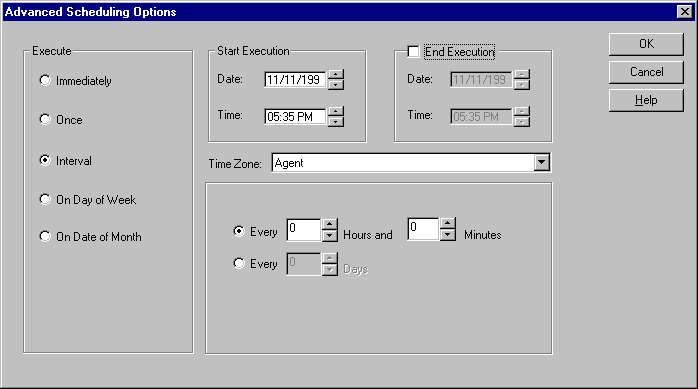 Select the frequency with which you want the collection executed. The lower right pane changes format depending on the choice in the Execute field. The choices are: