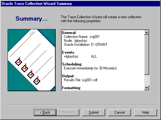 At this point, you can click the Finish button. If you do, Oracle Trace accepts all of the defaults for scheduling and formatting information. These will be displayed on the Summary page (see Figure 3-14).