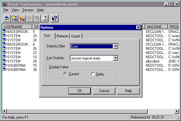 By default, the top n sessions in the main display are sorted by the session logical reads statistic. If you want to change the sort statistic and / or the statistic filter, choose Options on the Session menu. This displays the Options property sheet, on which you can customize the session information displayed in the main display. See "Customizing the Session Information You Display" for more information about using the Options property sheet.