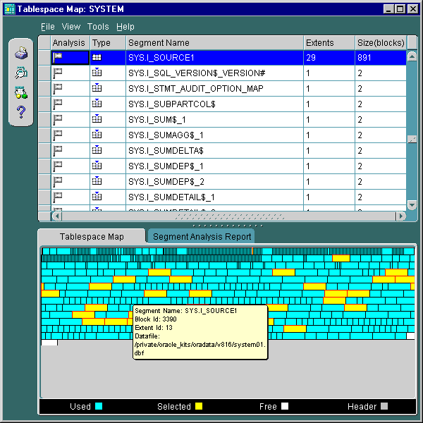 Another key feature of the Tablespace Map is the Segment Analysis tool. A Segment Analysis can detect potential space management problems. Once a Segment Analysis has been performed, a Segment Analysis report is created and provides a detailed listing of any detected problems and marks the problematic segments with a warning or alert flag. See Analyzing Segments in a Tablespace.