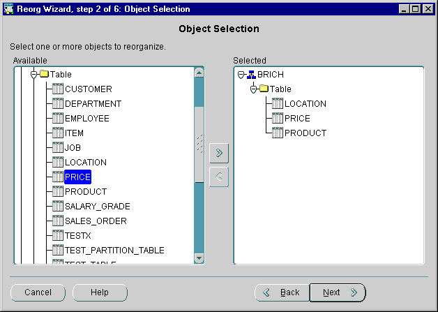 A list of available objects is displayed. The wizard allows you to select the objects you wish to reorganize.