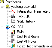 Clicking on the "+" symbol for a Database reveals the Initialization Parameters, TopSQL, SQL History, SQL Statement, Explain Plan, and Tuning Recommendation objects related to that database.
