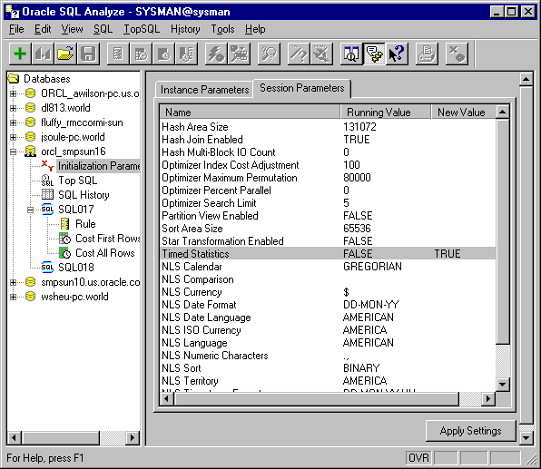 Clicking on the Initialization Parameters object displays instance parameters you can edit to simulate different database environments.