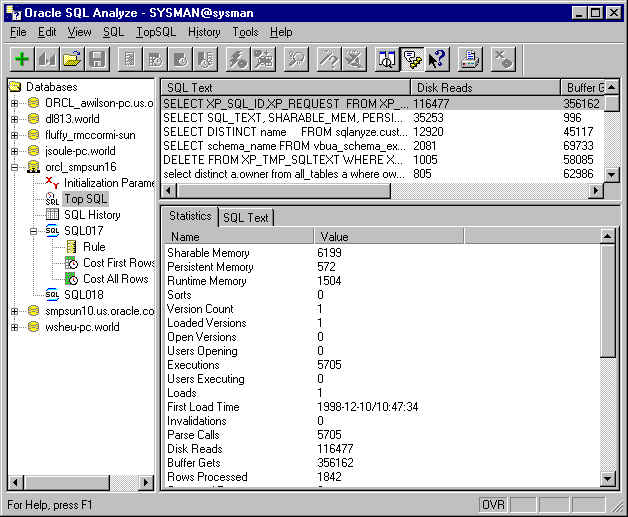 You can use the TopSQL function to sort the statements located in the V$SQLAREA view (those statements that have been run or are ready to be run against the database) according to their resource consumption. TopSQL is described in the next section, "Selecting Statements with TopSQL."