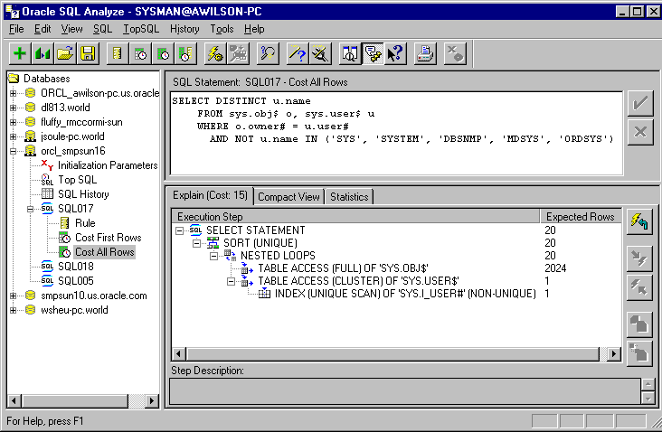 The Explain Plan object contains a single explain plan generated for the SQL statement. Oracle SQL Analyze lets you generate Rule-based explain plans for all SQL statements, and Cost-based explain plans for SQL statements that have been analyzed with the ANALYZE command.