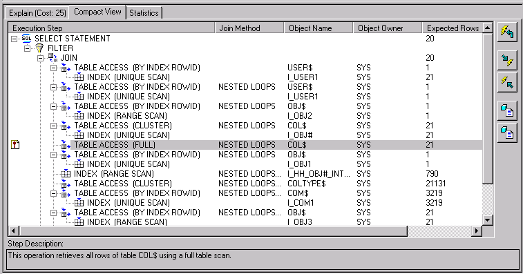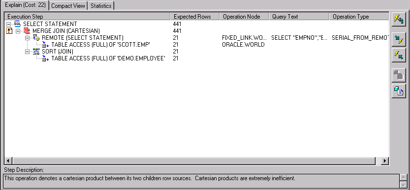 As Oracle SQL Analyze generates an explain plan for your SQL statement, it applies certain Explain Plan Rules-of-Thumb and identifies steps in the explain plan where problems may occur. These steps are flagged by an exclamation mark. You can get the details for these Rules-of-Thumb by selecting the identified row in the explain plan and selecting the Plan Step Properties button. See "Stepping Through Explain Plans" for more details.