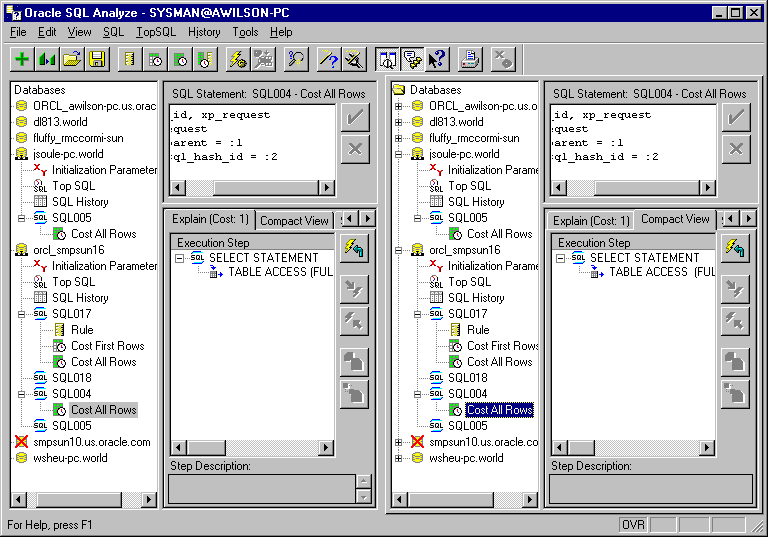 Comparing explain plans is a powerful tool to analyze the improvements you have made while tuning your SQL statements. Oracle SQL Analyze lets you create a split view in which you can open two different SQL statements and compare results.