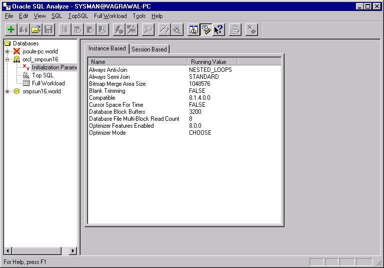 The session based parameters affect memory and disk performance. You can edit these values from within Oracle SQL Analyze to simulate a different environment, or to test the effect these parameters have on your database performance.
