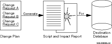 To evaluate the impact of the change requests at a particular database, you use Oracle Change Management Pack to generate a script and an impact report for a change plan and that destination database. The impact report explains the changes that will be made by the script when it executes at the destination database. It also describes any change requests that cannot be applied at the destination database, and explains how to modify the destination database or change plan so that those changes can be made. See "Viewing the Impact Report and Script Summary with Plan Editor" for more information about the impact report.
